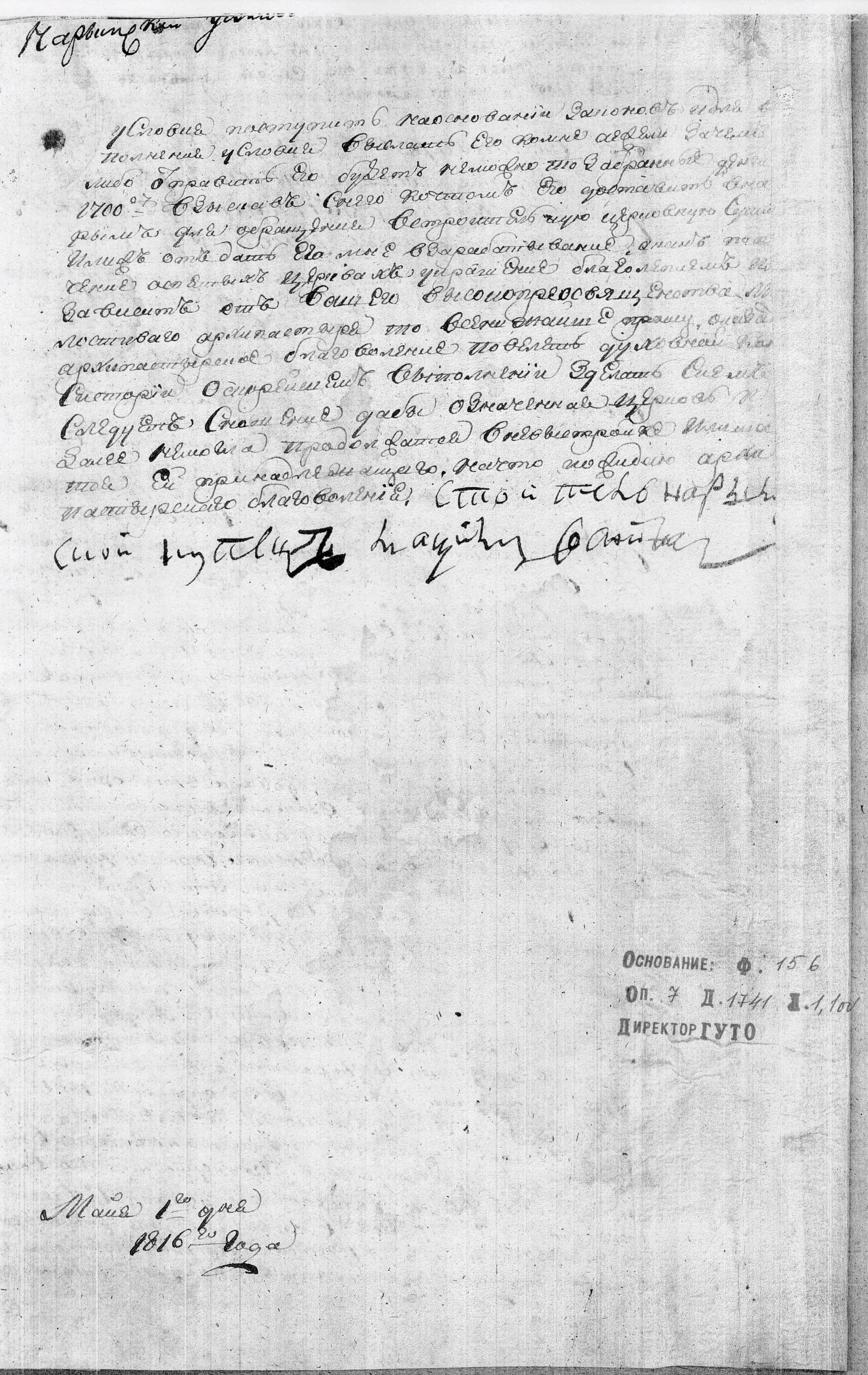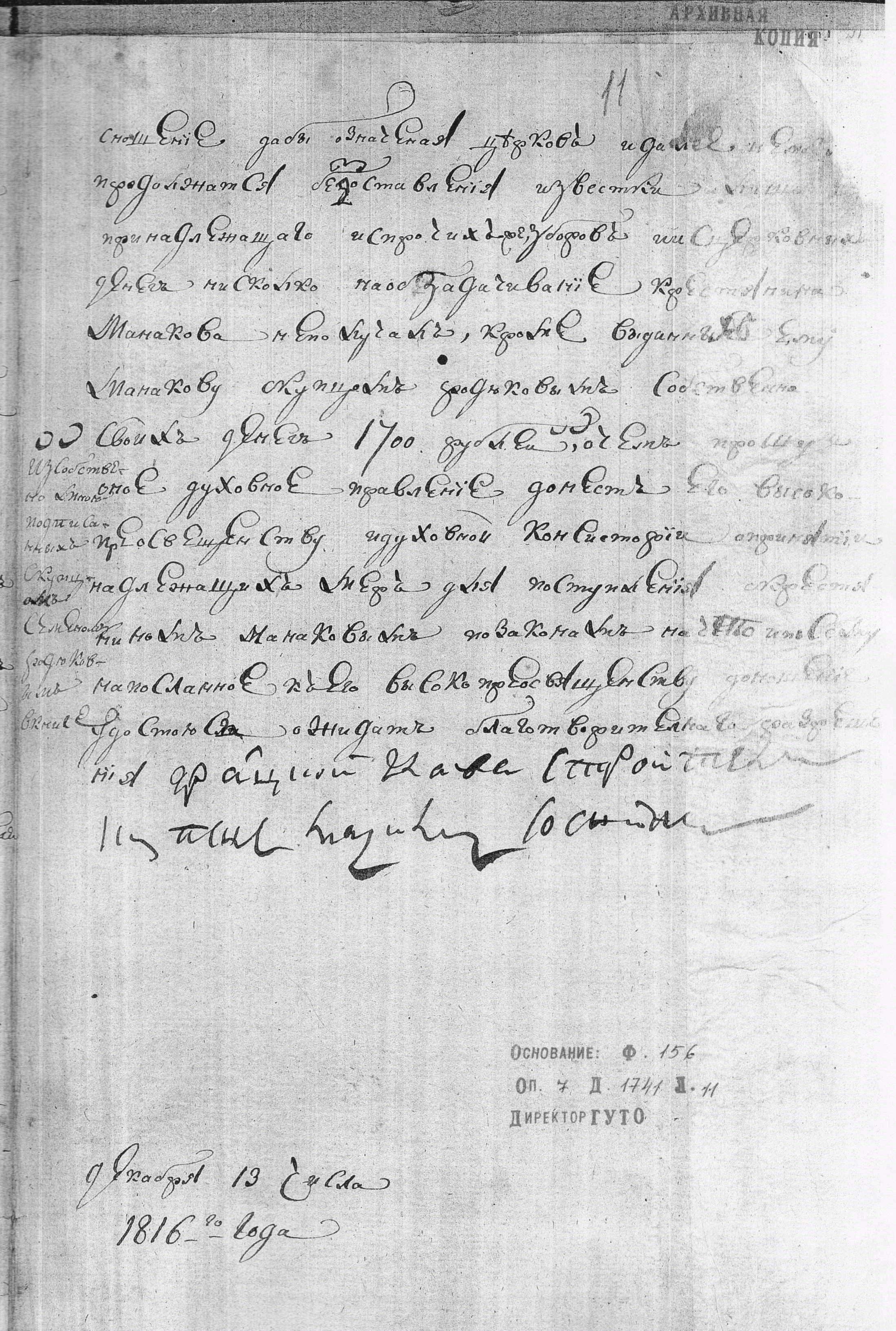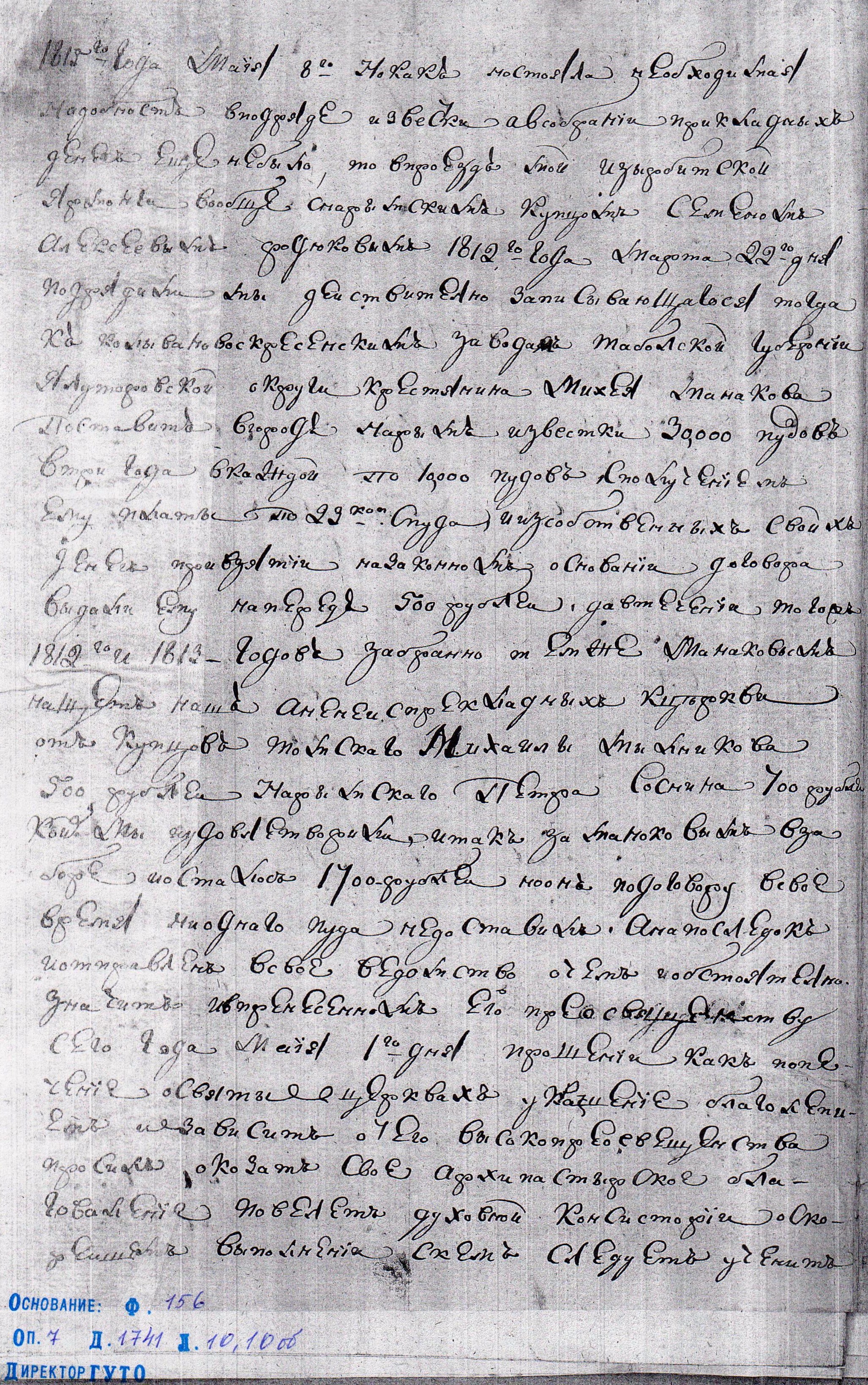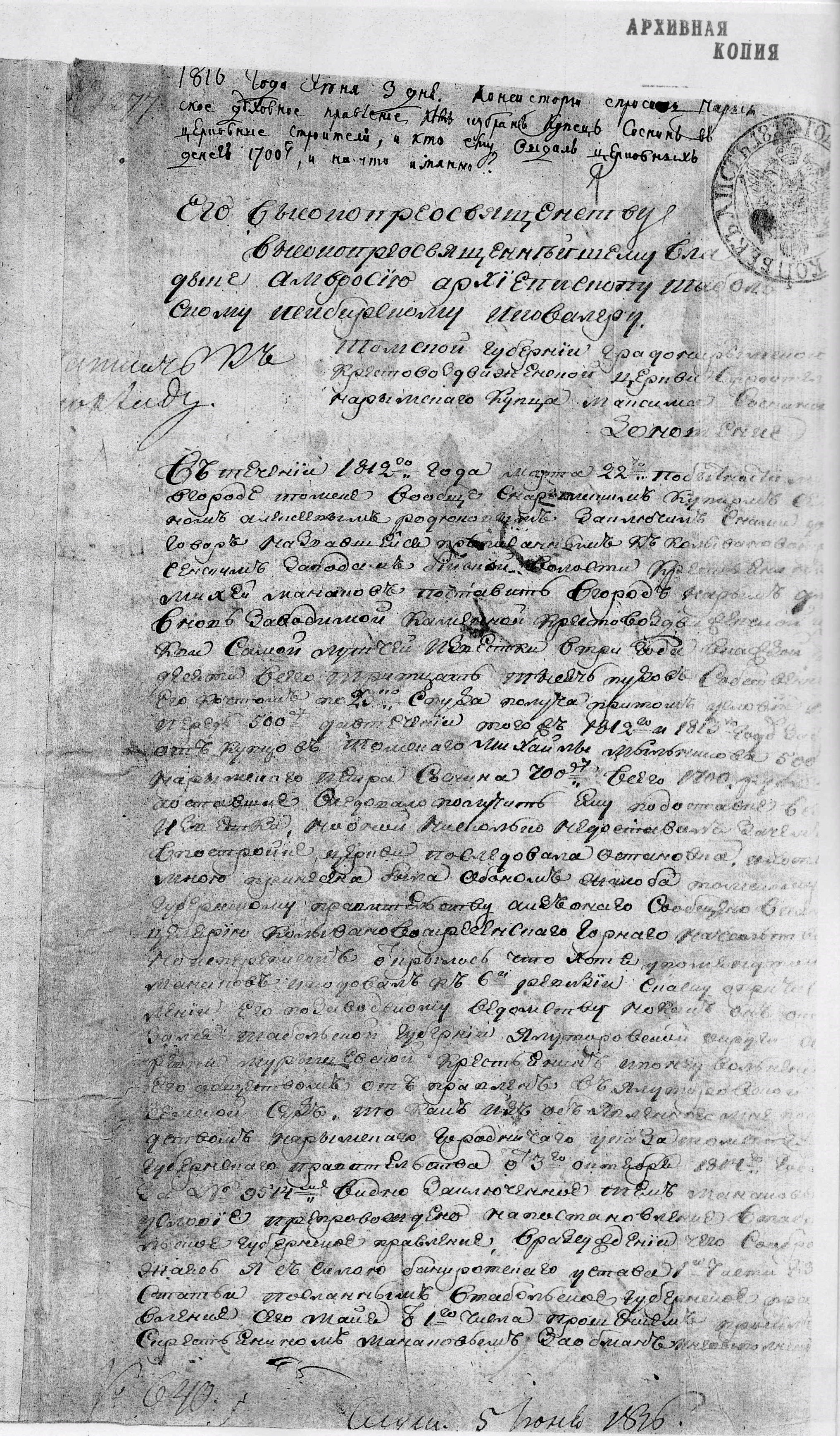 «1816 года Июня 3 дня. Консистории спросить Нарымское духовное правление кем избран купец Соснин в церковные строители, и кто ему отдал церковных денег 1700 р., и на что имянно?».