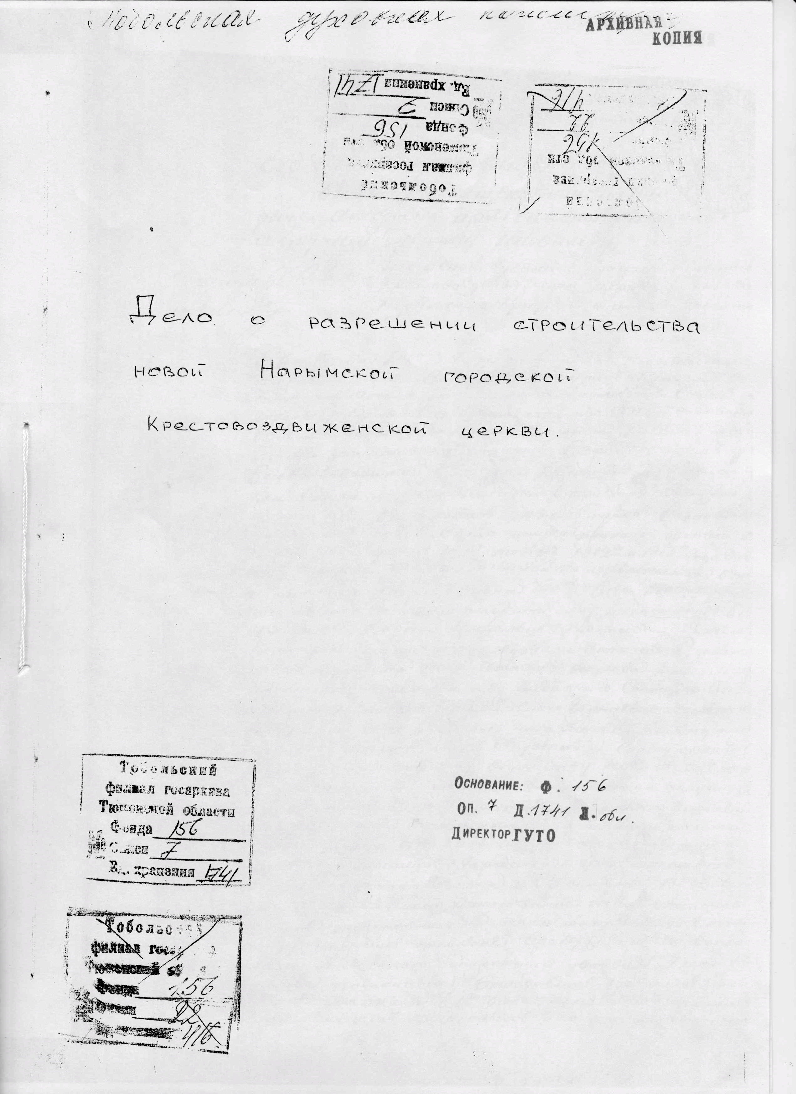 3Дело о разрешении строительства новой Нарымской городской Крестовоздвиженской церкви // ГБУТО ГА (Тобольск). Ф. и-156. Оп. 7. Д. 1741.