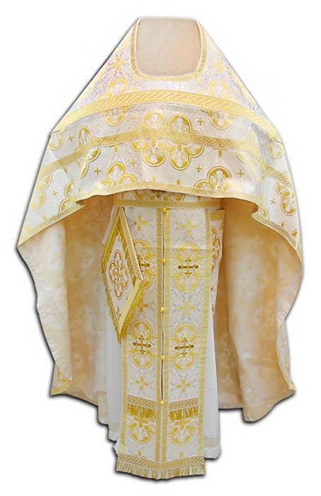 и 6) Священническая риза белаго глозета, шитая золотом, с изображением на оплечьях Воскресения Христова, ценою в 350 руб., пожерт. в 1875 г. Ив. Родюковым».