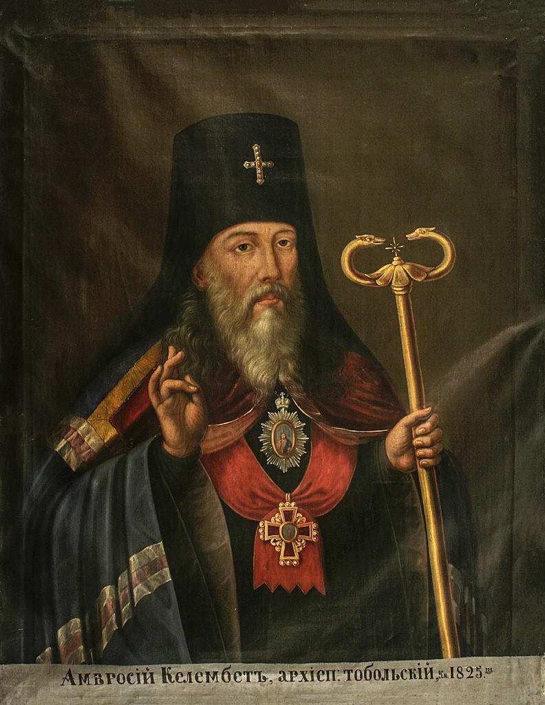 4Амвросий (в миру Андрей Петрович Келембет; 1750-1825) - архиепископ Тобольский и Сибирский. Занимал эту должность с 25 мая 1806 года по 21 декабря 1822 года. Деятельность. Заботился о Тобольской духовной семинарии: построил для неё новый каменный корпус, открыл в Томском Алексиевском монастыре трёхклассное латино-русское училище. По инициативе Амвросия в 1820 году на хантыйский и мансийский языки был переведён Новый Завет, не получивший, однако, одобрения духовной цензуры в Петербурге. Боролся со злоупотреблениями местной администрации, пользовавшейся покровительством сибирского генерал-губернатора И. Б. Пестеля и иркутского губернатора Трескина. В 1821 году подал прошение об отставке по болезни, но Святейшим Синодом был оставлен на кафедре. 28 октября 1822 года по собственной просьбе архиепископ был уволен на покой во Мгарский Преображенский монастырь, где скончался 4 июля 1825 года. Источник: Интернет.