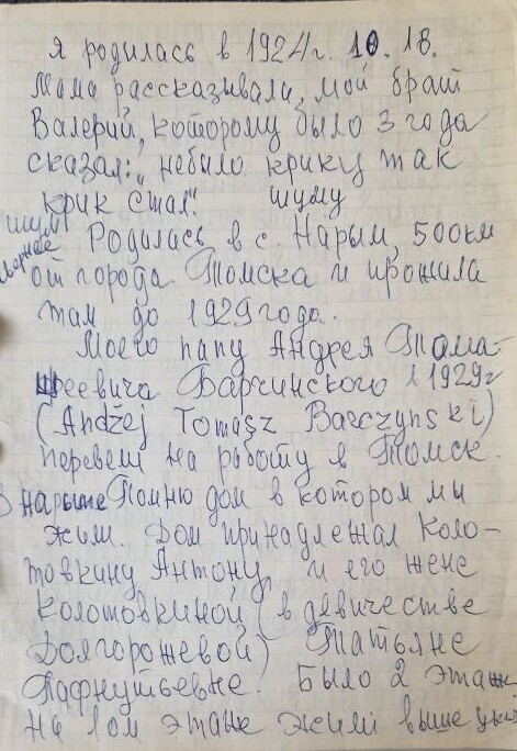 В Нарыме помню дом, в котором мы жили. Дом принадлежал Колотовкину Антону и его жене Колотовкиной (в девичестве Долгорожевой) Татьяне Пафнутьевне. Было 2 этажа: на 1ом этаже жили выше указ. мои дедушка с бабушкой, на 2ом наша семья, Андрей Барчинский и мама Мария (Марфа) Антоновна Барчинская (в девичестве Колотовкина). Дети Валентина 1917 г.р., Вера 1918 г.р., Валерий 1921 г.р., Галина 1924 г.р.