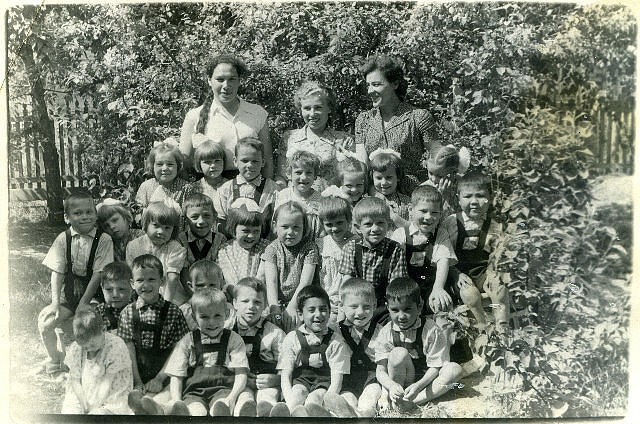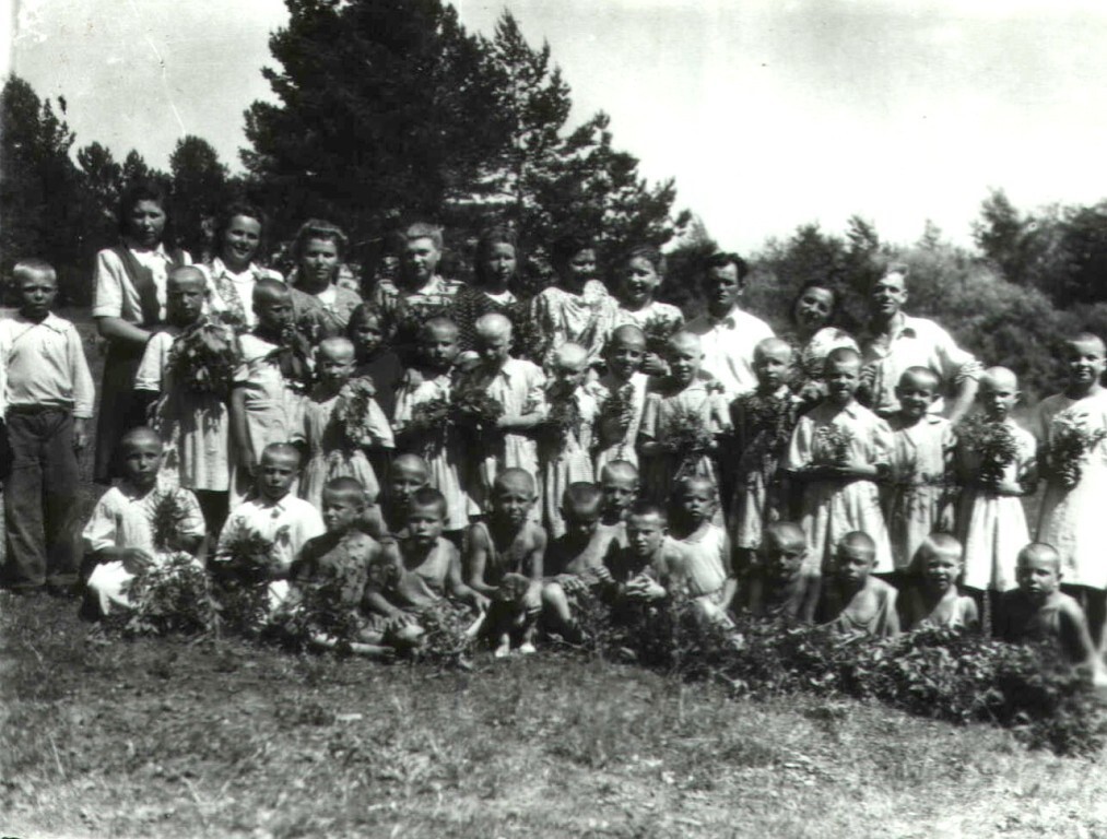 На фото соснового бора группа воспитанников детдома с воспитателями: Абакумовой А., Кактус Г., Мизгиревой М.А., Чайниковой З.П., Хомяковой В.С., Старабахиной С.И., Мищенко Н.Ф. 1951 -52 г.г.