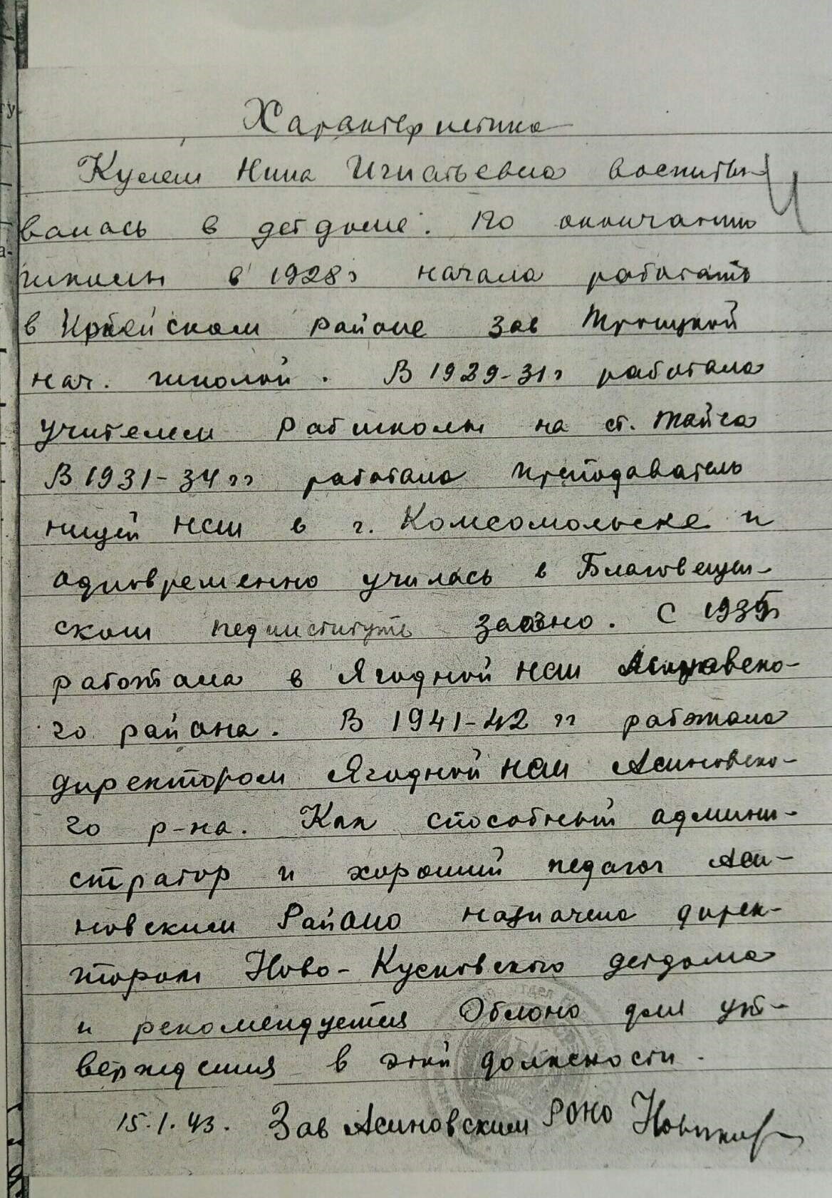 «Как способный администратор и хороший педагог Асиновским РОНО была назначена на должность директора Ново-Кусковского детдома и рекомендуется Облоно для утверждения в этой должности» - так написано в характеристике данной зав. Асиновского РОНО 15.01.1943 г.