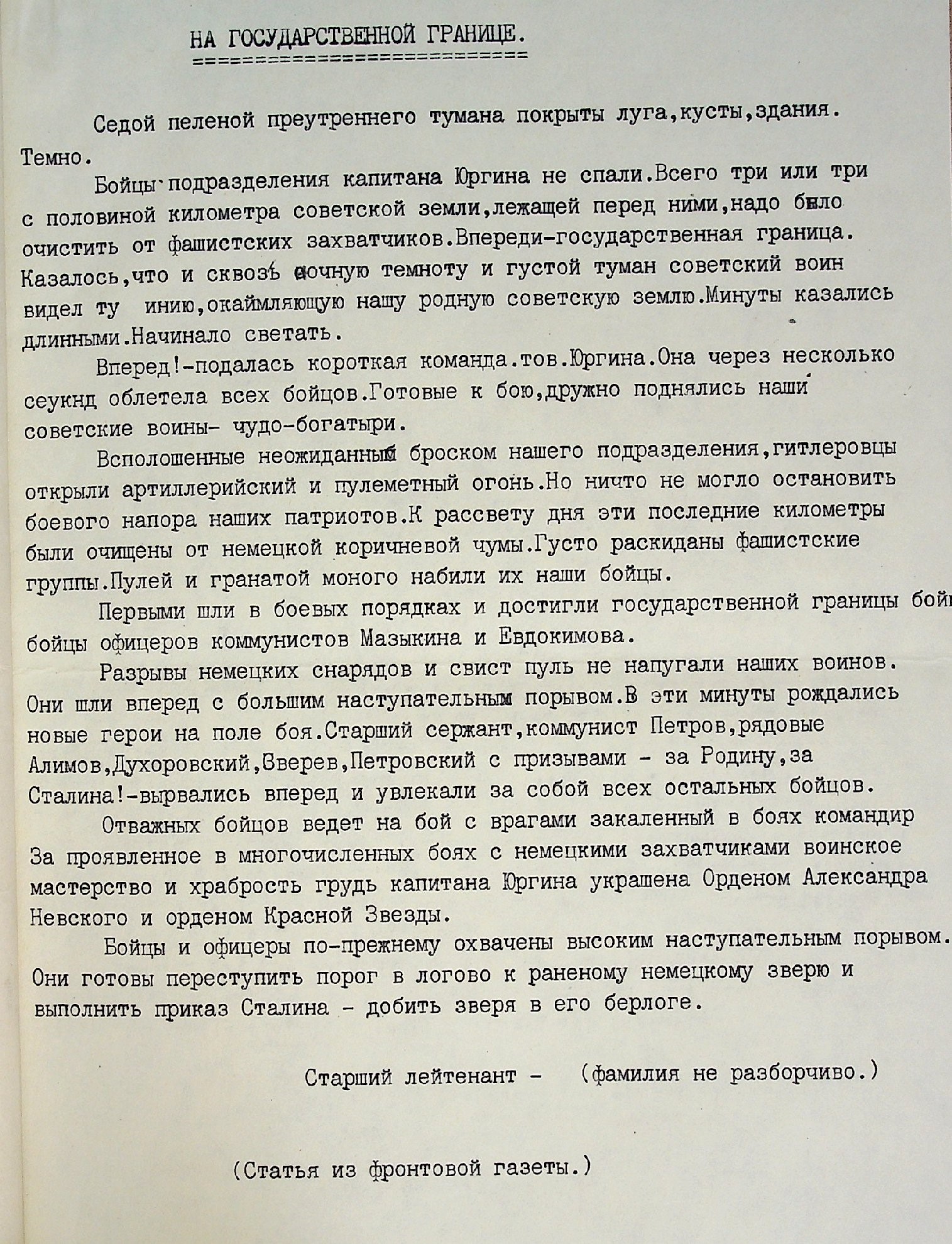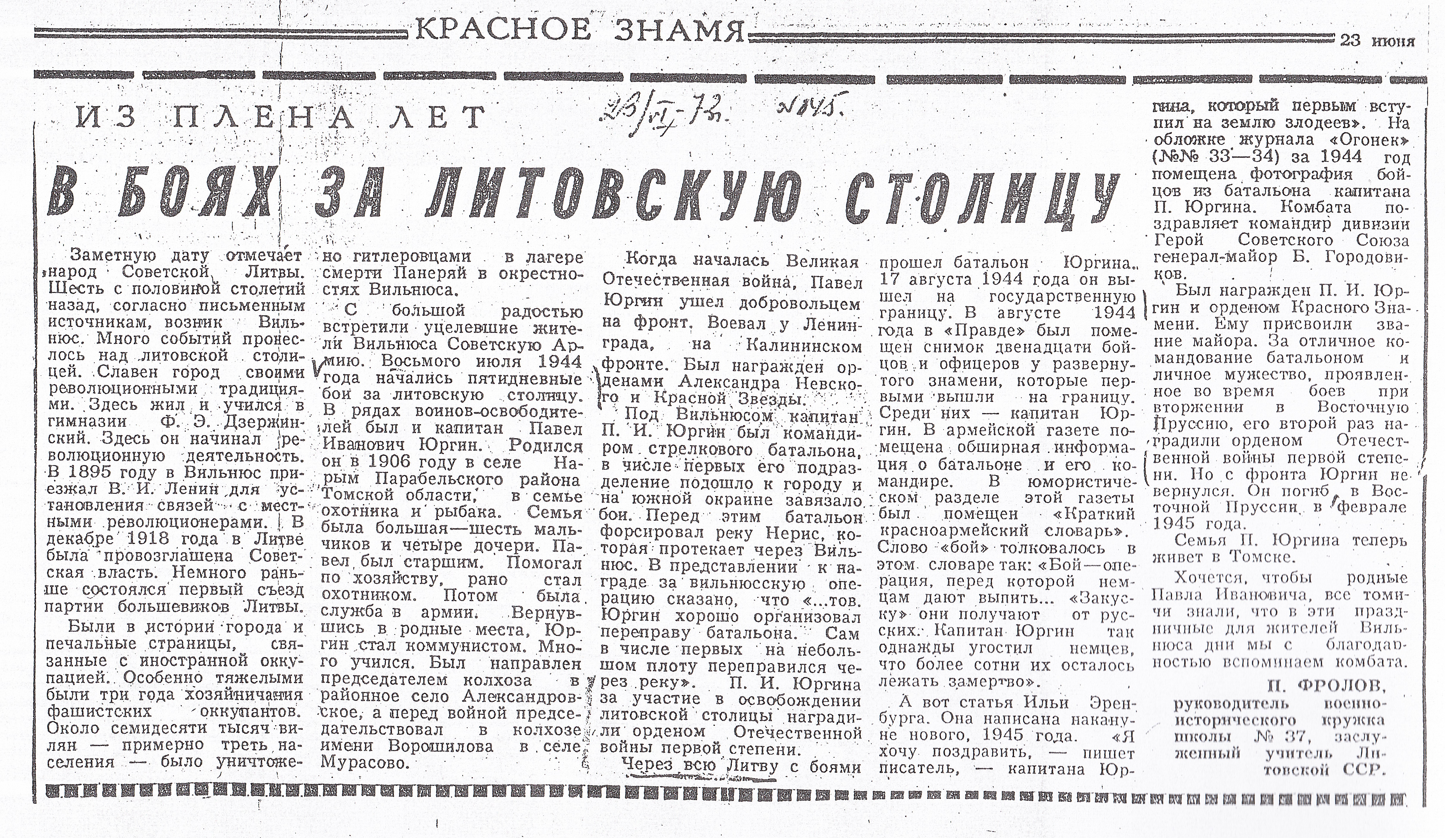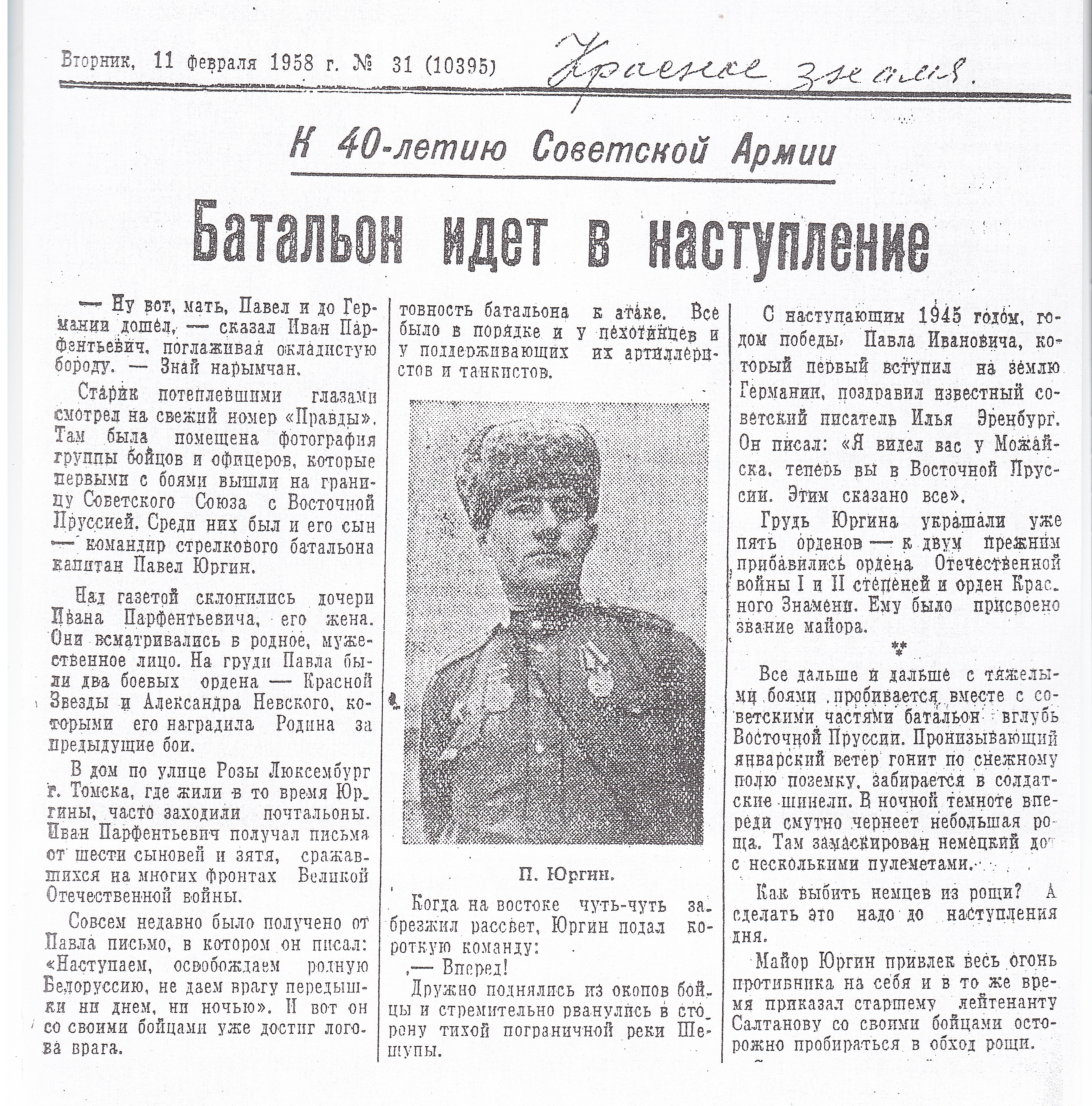 Мы начинаем публикацию материалов о майоре П.И. Юргине, командире батальона 184 стрелковой дивизии, который в августе 1944 г. первый вышел на государственную границу с Восточной Пруссией. В ходе кровопролитных боёв из роты к границе вышло всего 19 человек.