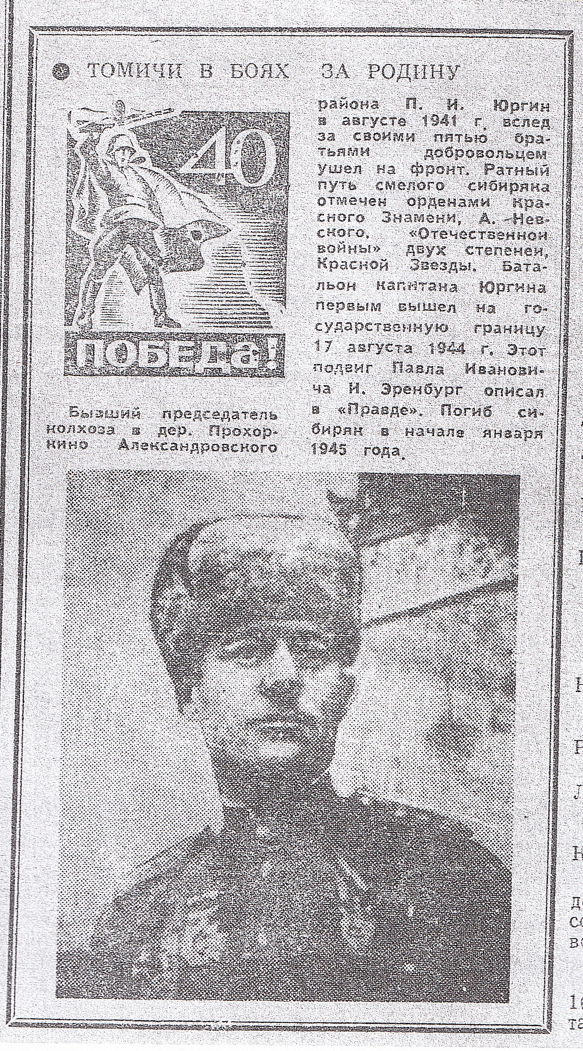 Юргин Павел Иванович (1906-1945). Командир первого батальона, перешедшего западную границу СССР в Восточной Пруссии