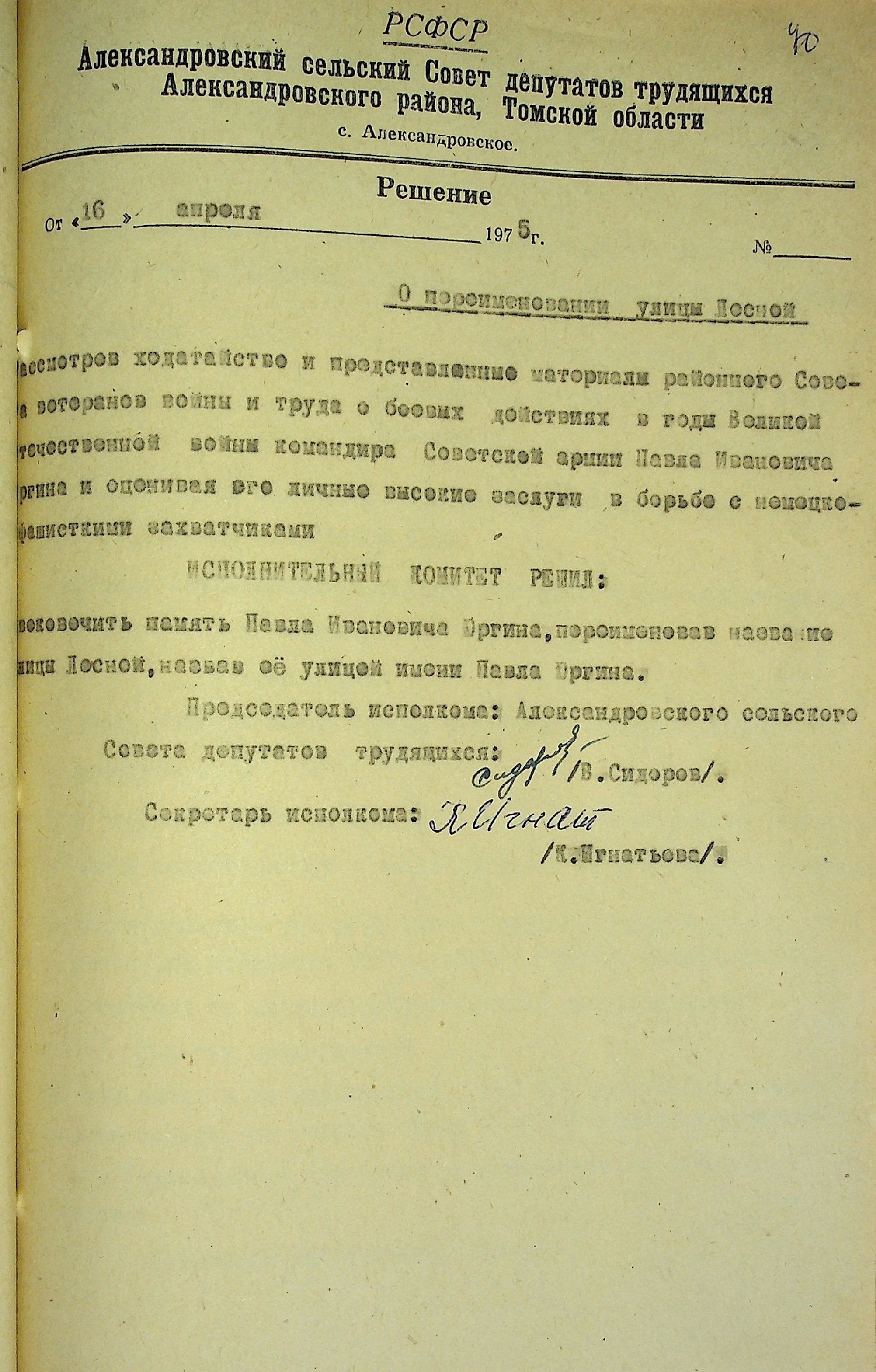 Решением Александровского сельского Совета от 16.04.1975 года № (без номера), по ходатайству районного Совета ветеранов войны и труда, оценивая личные высокие заслуги Павла Ивановича Юргина в борьбе с немецко-фашистскими захватчиками, увековечили память переименованием улицы Лесной села Александровское, назвав ее улицей имени Павла Юргина. (ф. 19, о. 1, д. 936, л. 40)