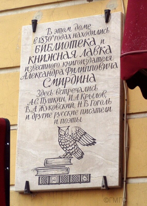 Установка мемориальной доски состоялась в 1995 году, в связи с юбилеем А.Ф. Смирдина и в связи с предстоящим в 1999 году юбилеем А.С. Пушкина. На мемориальной доске можно прочитать следующий текст: «В этом доме в 1830-е годы находилась библиотека и книжная лавка известного книгоиздателя Александра Филипповича Смирдина. Здесь встречались А. С. Пушкин, И. А. Крылов, В. А. Жуковский, Н. В. Гоголь и другие русские писатели и поэты».