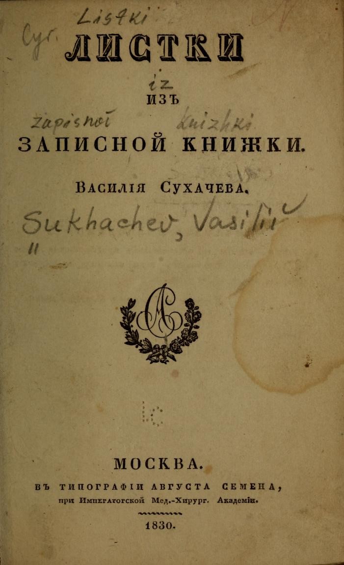 Иван Никанорович Розанов (1874-1959) – русский и советский историк русской поэзии, библиограф, книговед писал: «Очень редкая книжка «Листки из записной книжки Василия Сухачева» (М., 1830), в которой помещено три ранних стихотворения Кольцова - это первое появление имени поэта в печати»3.