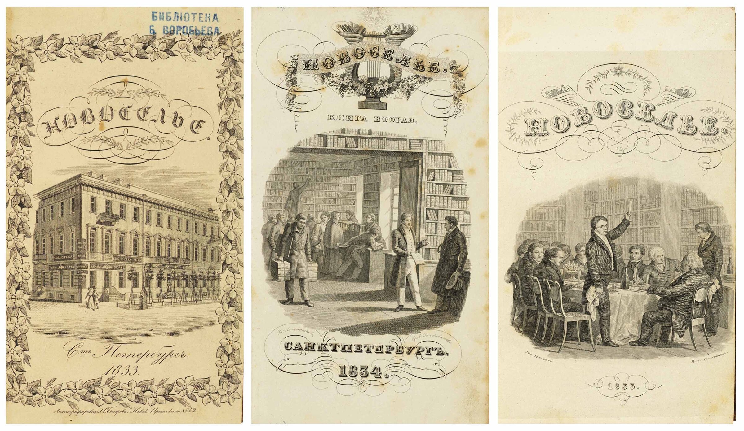 Альманах «Новоселье» был напечатан в типографии А.И. Плюшара; первый выпуск альманаха был оформлен гравюрами, на которых были изображены внешний вид здания, в котором находился книжный магазин Смирдина а также интерьеры книжного магазина – парадная анфилада комнат, стеллажи с книгами; кроме того, на одной из гравюр было изображено литературное застолье – праздник в честь новоселья книжного магазина.