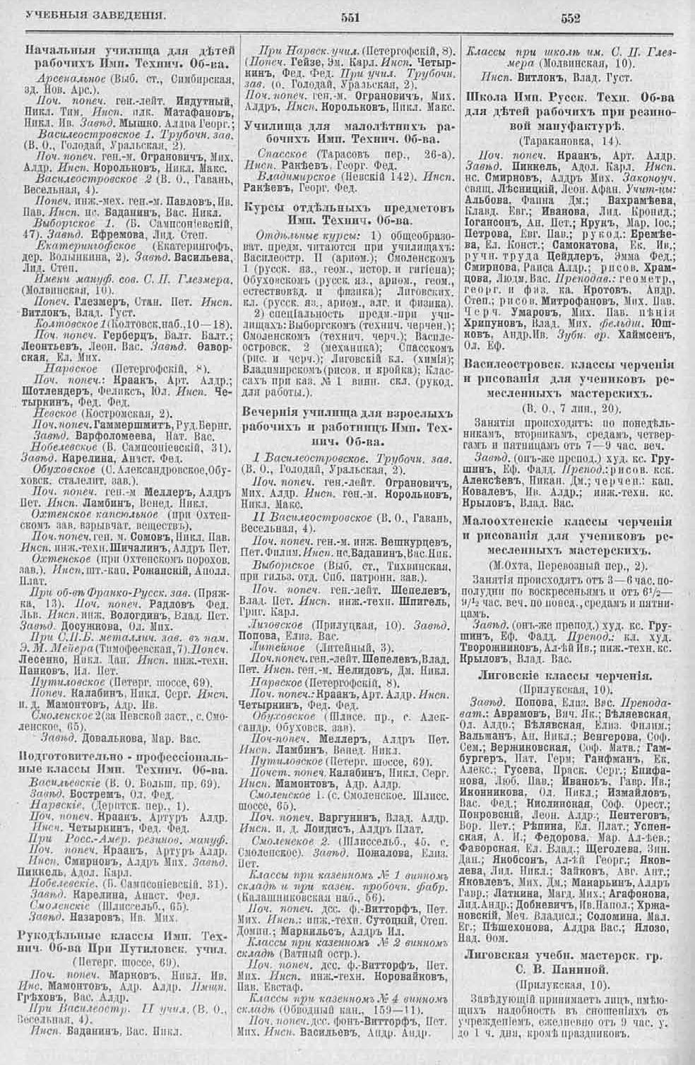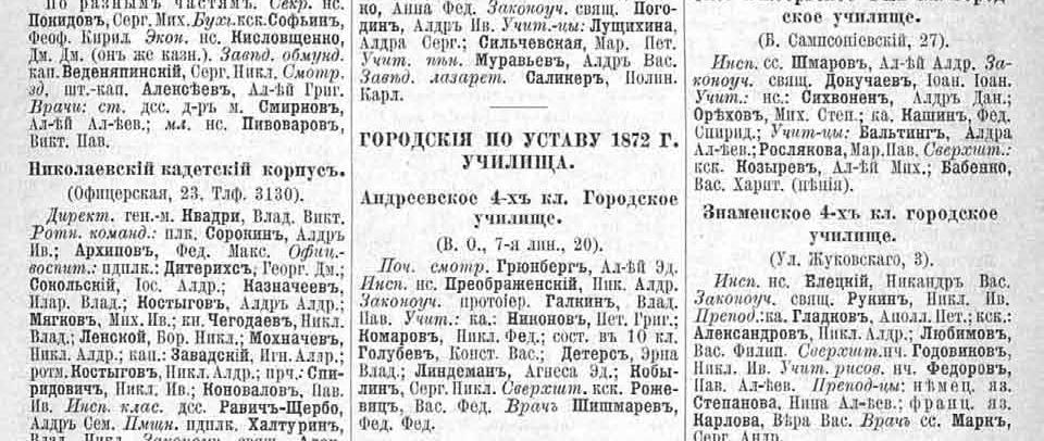 2Весь Петербург на 1909: С. 641: Преображенский Никл. Алдр. нс. В.О. 7 лин., 20. Инсп. Андр. 4 кл. гор. уч.; Тов. предс. правл. об-ва всп. нужд. уч. Андр. гор. уч.; … на 1910: С. 689: Преображенский Никл. Алдр. нс. В.О. 7 лин., 20. Инсп. Андр. 4 кл. гор. уч.; Тов. предс. об-ва всп. нужд. уч. Андр. гор. уч.; … на 1911: С. 724:. Преображенский Никл. Алдр. нс. В.О. 7 лин., 20. Инсп. Андр. 4 кл. гор. уч.; Тов. предс. об-ва всп. нужд. уч. Андр. гор. уч.; Веч. уч. для взросл. раб. и работ. И. Т. об-ва; …на 1913: С. 515: Преображенский Никл. Алдр. нс. В.О. 7 лин., 20. Т 58942. Завед. Андр. высш. нач. уч.; Тов. предс. об-ва всп. нужд. уч. Андр. высш. нач. уч.; …на 1914: С. 535: Преображенский Никл. Алдр. нс. В.О. 7 лин., 20. Т 58942. Инсп. Андр. высш. нач. уч.; Тов. предс. об-ва всп. нужд. уч. Андр. высш. нач. уч.; … на 1915: С. 533: Преображенский Никл. Алдр. нс. В.О. 7 лин., 20. Т 58942. Инсп. Андр. высш. нач. уч.; Тов. предс. об-ва всп. нужд. уч. Андр. высш. нач. уч.; Весь Петроград: адресная и справочная книга г. Петрограда на 1916 год: С. 552: Преображенский Никл. Алдр. нс. В.О. 7 лин., 20. Т 58942. Инсп. Андр. высш. нач. уч.; Ремесл. кл. Имп. Алекс. III для приход. учен.; … на 1917 год: С. 557: Преображенский Никл. Алдр. нс. В.О. 7 лин., 20. Т 58942. Инсп. Андр. высш. нач. уч.; Ремесл. кл. Имп. Алекс. III для приход. учен.