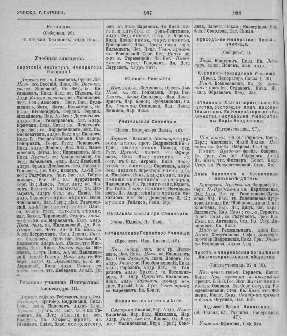 6Весь Петербург на 1899: Стб. 962: Гатчина. Пятиклассное Городское училище (Проспект Имп. Павла I, 48). Поч. смотр.: прапорщ. Лытиков, Павл. Никл.; нс. Коноплев, Вас. Степ. <…> Учит.: ка. Преображенский, Никл. Алдр.; Весь Петербург на 1900: Стб. 997: Гатчина. Пятиклассное Городское училище (Просп. Имп. Павла I, 48). <…> Учит.: нс. Преображенский, Никл. Алдр.; Весь Петербург на 1901: С. 468: Преображенский Никл. Алдр. нс. Гатчина, просп. Имп. Павла I, 48. 5-кл. гор. учил.; Весь Петербург на 1902: С. 573: Преображенский Никл. Алдр. н.с. Гатчина. Просп. имп. Павла I, 48. 5-кл. гор. учил.; Весь Петербург на 1903: С. 537: Преображенский Никл. Алдр. н.с. Гатчина. Гатчинск. 5-кл. гор. учил.; Гатчинск. нач. шк. при семин.; Весь Петербург на 1904: С. 529: Преображенская Анис. Пет. ж. нс. Гатчина, Пр. имп. Павла I, 48; Преображенский Никл. Алдр. н.с. Гатчина.Гатчинск. 5-кл. гор. учил.; Весь Петербург на 1905: Стб. 1048: Гатчина <…> Стб. 1051: Пятиклассное Городское училище (Просп. Имп. Павла I, 48) <…> Учит.: нс. Преображенский, Никл. Алдр.; Алфативный указ. жителей: С. 523: Преображенский Никл. Алдр. н.с. Гатчина, пр. Имп. Павла I, 48. Гатчинск. 5-кл. гор. учил.; Весь Петербург на 1906: С. 538: Преображенский Никл. Алдр. н.с. Гатчина. Гатчинск. 5-кл. гор. учил.