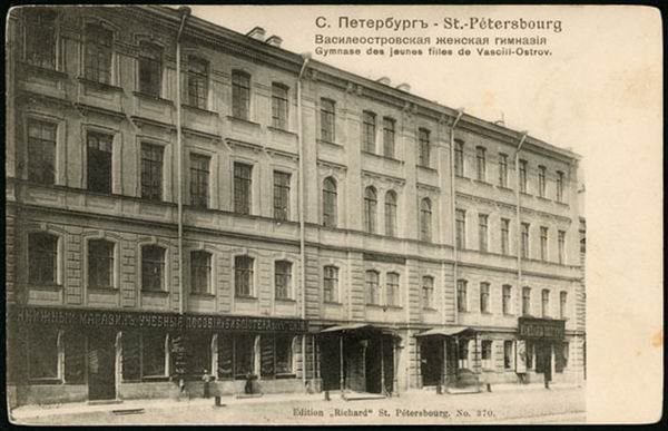 3На 9-й линии Васильевского острова, дом 6, находится школа, история которой началась еще в 1858 году. В 1862 году женское училище было реорганизовано в Василеостровскую женскую гимназию. С 1873 года гимназия стала располагаться в четырехэтажном здании, построенном по проекту архитектора Г.Х. Штегемана. Гимназия представляла собой среднюю школу с семью основными классами, пятью параллельными и одним приготовительным. К обучению принимались девочки с 9 лет, всех сословий и вероисповеданий. Получив статус гимназии, в школе был открыт восьмой педагогический класс для подготовки будущих домашних учительниц и наставниц. Вводилась новая учебная дисциплина «Основы педагогики». Обучение было платным и составляло 100 руб. в год. В 1879 году появилось «Общество вспомоществования нуждающимся ученицам», почетными членами которого были Иоанн Кронштадтский, Д.Н. Мамин-Сибиряк, И.Е. Репин. Членские взносы, частные пожертвования, вырученные от концертов и вечеров деньги, составляли основу капитала Общества. Членами общества были учителя гимназии, родители учащихся и бывшие выпускницы. Известными выпускницами Василеостровской Мариинской гимназии стали: поэтесса Елизавета Ивановна Дмитриева, известная под литературным псевдонимом Черубина де Габриак, актриса Елизавета Ивановна Тиме, писательница Мария Андреевна Бекетова (первый биограф Александра Блока) и ее сестра Александра Андреевна Кублицкая - Пиоттух, урожденная Бекетова (мать Александра Блока).