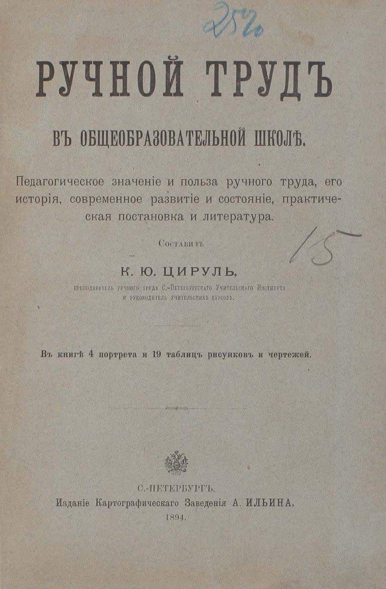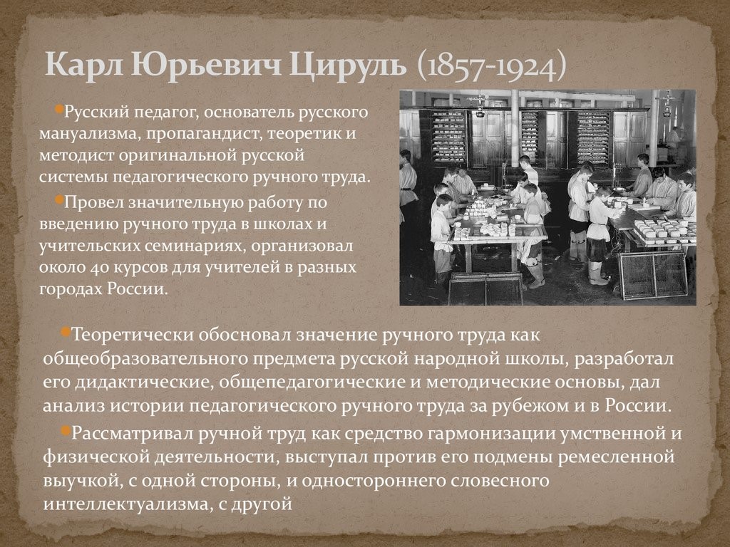 11Цируль Карл Юрьевич (6.11.1857, дер. Баложи Рижского уезд.–1924, Петроград), российский педагог, деятель в области трудового обучения. Окончил Санкт-Петербургский учительский институт (1883), в 1884-1912 гг. преподавал в нём ручной труд, после 1917 г. в Петроградском педагогическом институте (ныне Российский государственный педагогический университет имени А.И. Герцена) и в школе 2-й ступени. <…> Создал предметно-операционную систему школьного обучения ручному труду, в которой основное внимание уделялось постепенному усложнению трудовых задач, овладению приёмами и инструментами и на этой основе – изготовлению конкретных «вещей». Деятельность Цируля и его сторонников способствовала тому, что ручной труд как общеобразовательный предмет был введён в учебных заведениях России (учительских институтах и семинариях, городских и сельских училищах). Инициировал создание Российского общества педагогического ручного труда (1909). Основал журнал «Трудовое воспитание» (1914, вышло 4 номера). Источник: Осовский Е. Г., Еналеева Н. И. Цируль Карл Юрьевич // Большая российская энциклопедия, 2017.