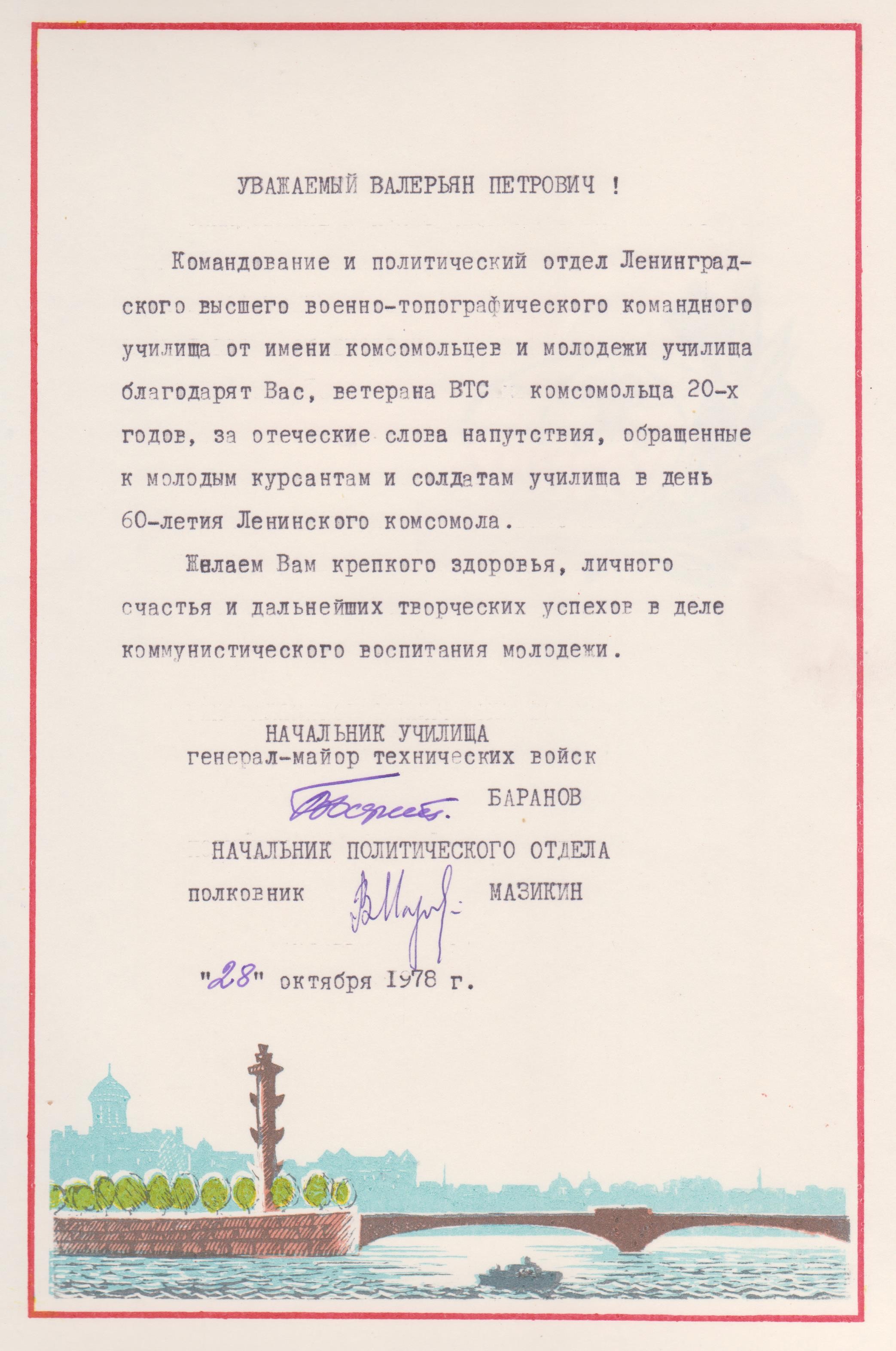 В октябре 1978 года еще одна славная годовщина – 60-летие Ленинского комсомола. Подготовка к этой дате – широкое поле деятельности для ветеранов-комсомольцев 20-х – 30-х годов. Вспомнят они и о первых шагах создания комсомола, героических временах Павки Корчагина, и о том, как курсанты Ленинградской военно-топографической школы, на полевых работах активно участвовали в жизни тогдашней деревни, где решались задачи коллективизации.