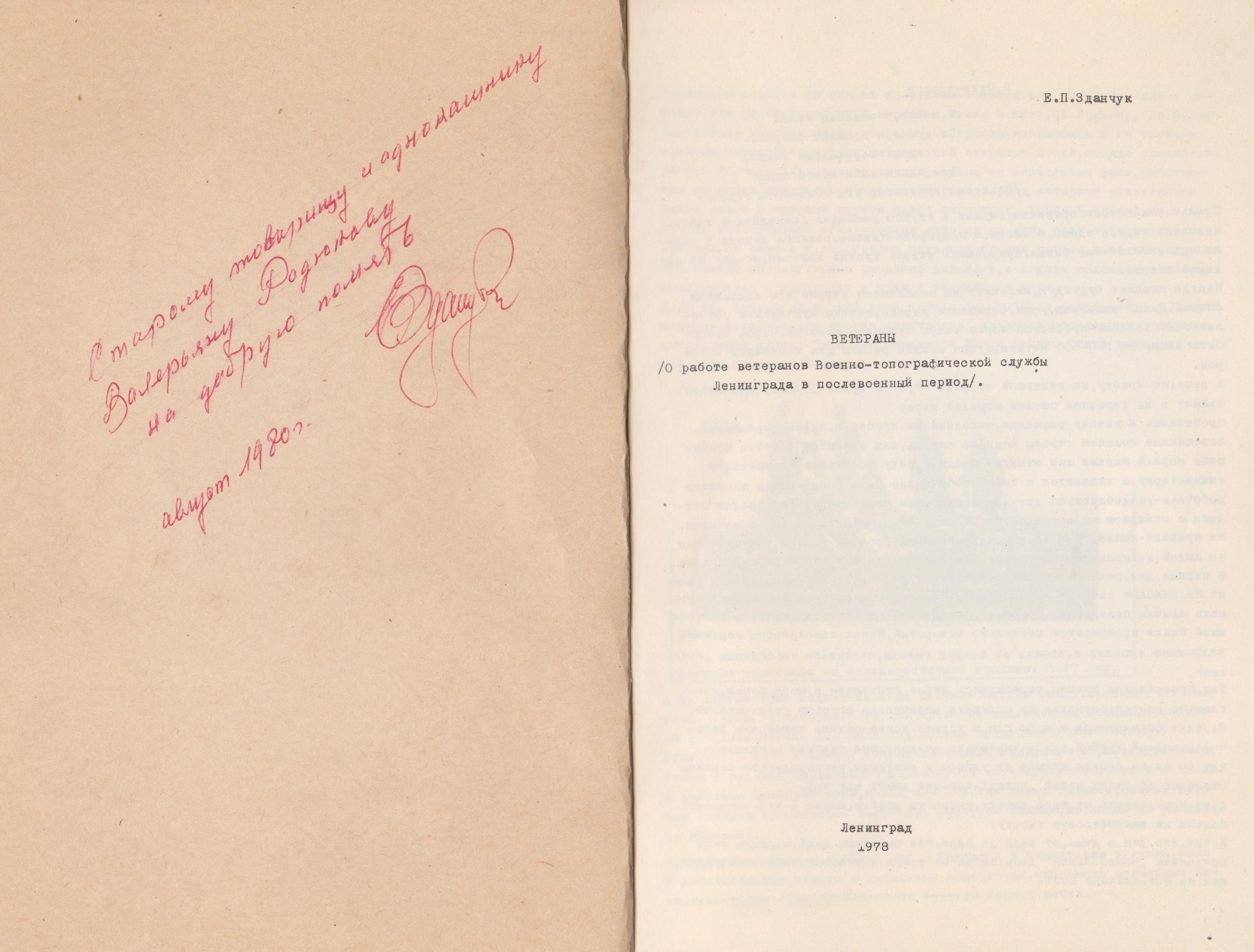 1Зданчук Е.П. Ветераны: [О работе ветеранов Военно-топографической службы Ленинграда в послевоенный период]. - Л., 1978. – 41 с. – Переплёт брошюры и надпись на ней сделаны В.П. Родюковым. – С. 33-37.