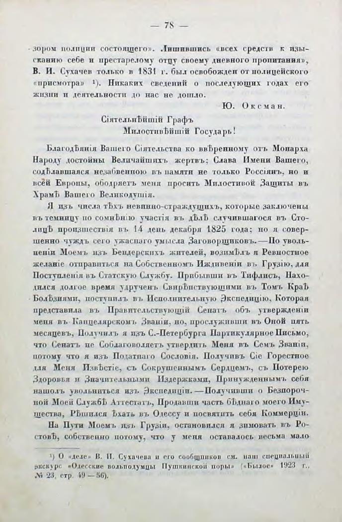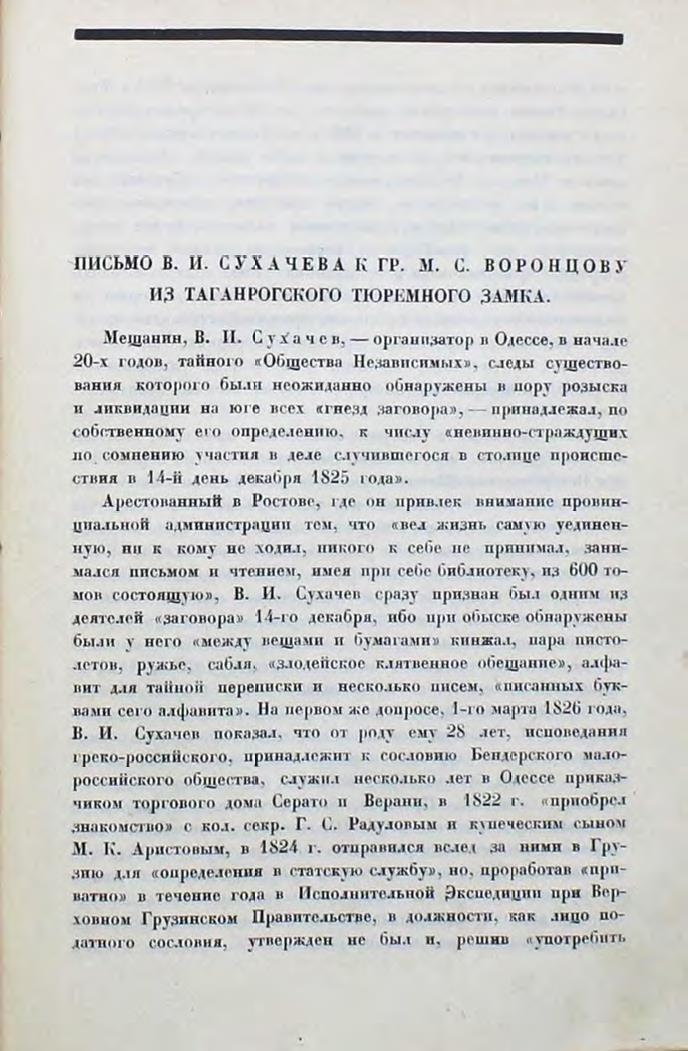 4Оксман Ю.Г. Письмо В.И. Сухачева к гр. М.С. Воронцову из Таганрогского тюремного замка // Декабристы: неизданные материалы и статьи. – М., 1925. – С. 75-80.