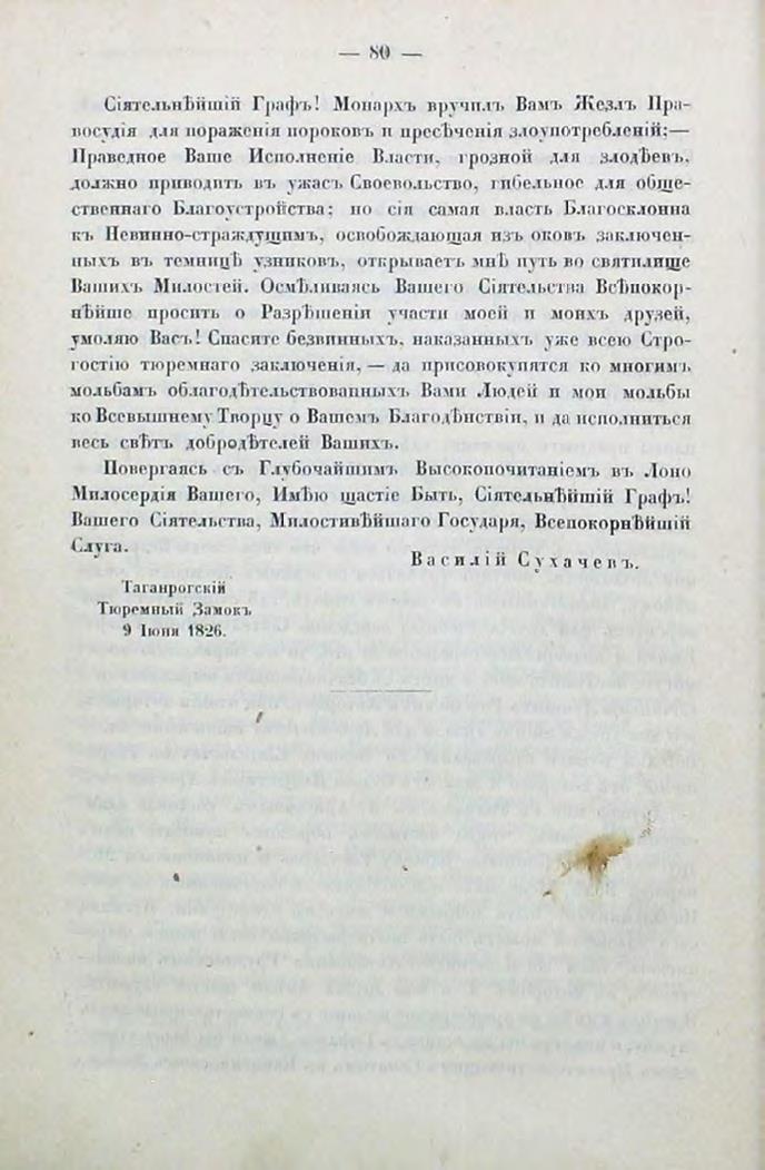 В 1925 году в «ТРУДАХ ПУШКИНСКОГО ДОМА» было опубликовано письмо нашего прапрадеда В.И. Сухачёва к графу М.С. Воронцову из Таганрогского тюремного замка от 9 июня 1826 года4.