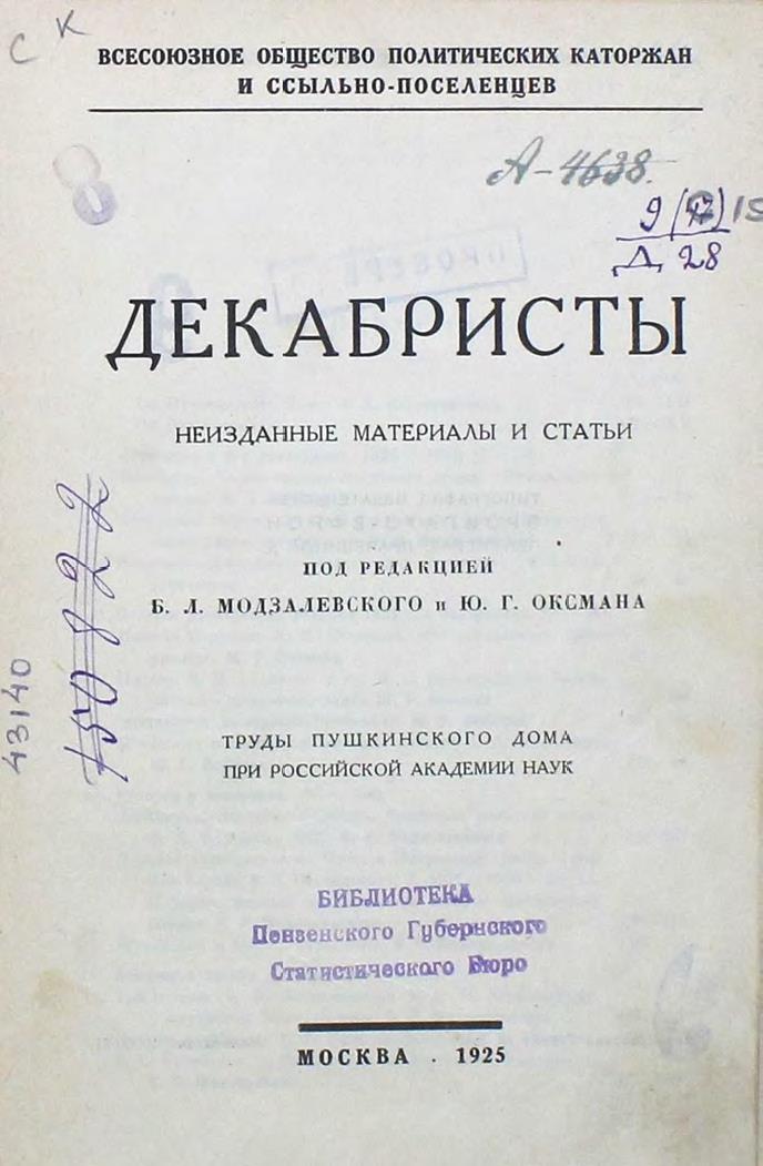 В 1923 году в журнале «БЫЛОЕ» (№ 21) была опубликована статья Ю.Г. Оксмана «Одесские вольнодумцы пушкинской поры»3. Журнал «Былое», посвященный истории освободительного и революционного движения, своим возникновением и своей жизнью обязан эпохам революционного подъема.
