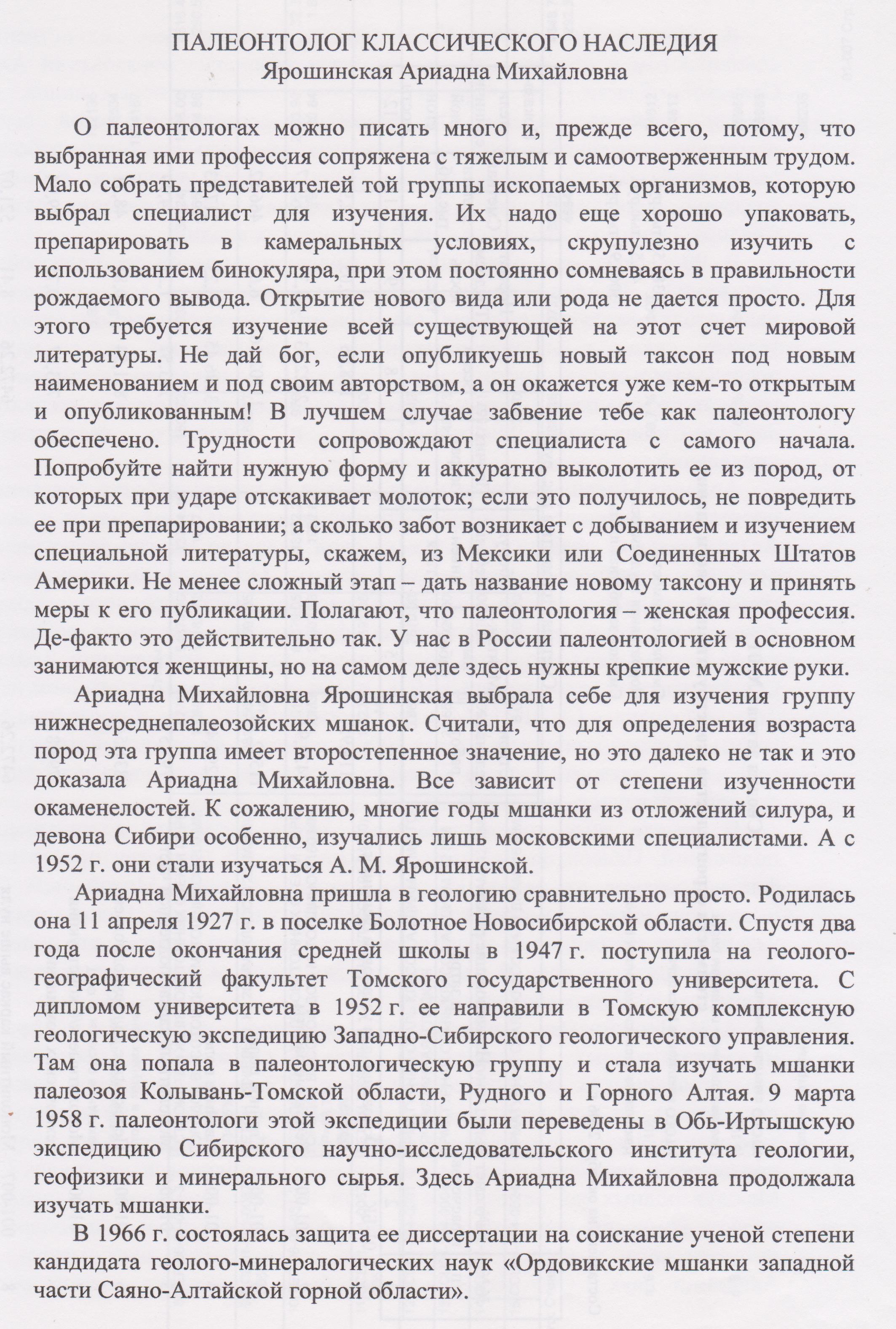 Ярошинская А.М. Ордовикские мшанки западной части Саяно-Алтайской горной области: Автореферат дисс. на соискание ученой степени кандидата геолого-минералогических наук. Научный руководитель – доктор геолого-минералогических наук профессор В.А. Ивания. - Томск: Изд-во Том. ун-та, 1965 [1966]. – 21 с. – (Мин-во высшего и среднего специального образования РСФСР. Том. орд. Тр. Кр. Зн. политехн. ин-т им. С.М. Кирова. Геолого-разведочный факультет).