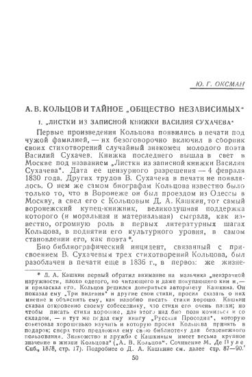 1 Оксман Ю.Г. А.В. Кольцов и тайное «Общество независимых» // Учен. зап. Саратовского гос. университета. Т. XX. 1948. С. 50-91. Сухачев Василий Иванович - организатор тайного «Общества независимых».