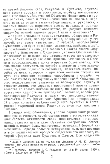 Рецензируемая книга поучительна еще и в том отношении, что обильный архивный материал дается в ней автором не в виде сухих и бесстрастных публикаций. Тонкий анализ произведений, глубокое проникновение в историю классических текстов на лучших страницах книги говорят о подлинном пафосе творческого исследовательского труда. На основе документальных материалов Ю. Оксман ставит новые проблемы или по-новому освещает старые. В этом ценность его книги, равно необходимой и историку русской общественной мысли, и историку литературы.