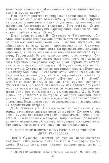 Много нового для понимания идейного становления Кольцова дает работа о связях поэта с тайным «Обществом независимых». Статья основана на включении в число литературных знакомств молодого Кольцова некоего В. Сухачева, связанного в прошлом с декабристскими кругами. Имя Сухачева фигурировало в деле Грибоедова, – он ранее служил в Одессе и в Грузии и в 1826 году был арестован в Ростове по подозрению в принадлежности к тайному обществу, имевшему название «Общество независимых». На основании следственного дела Сухачева Ю. Оксман приводит характерные данные, свидетельствующие о близости этой провинциальной группы вольнодумцев к программам декабристов. Знакомство Кольцова в 1829 году в Воронеже с находившимся там проездом Сухачевым было осуществлено через Д.А. Кашкина, местного книгопродавца, человека начитанного, последователя «новых идей». Все это, как справедливо указывает автор статьи, свидетельствует о том, что приобщение поэта к передовой культуре началось раньше, чем это обычно было принято думать.
