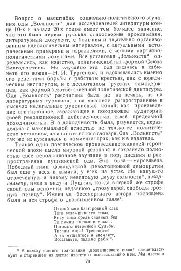 Но исследователь не ограничивается собиранием материалов, он по-новому оценивает и осмысливает их. Так, рассматривая «Историю Пугачева» и «Капитанскую дочку» в связи с «Путешествием» Радищева, Ю. Оксман приходит к выводу, что Пушкин «вслед за Радищевым» пошел дальше круга чаяний дворянских революционеров и имел в виду необходимость ликвидации крепостных отношений. Ю. Оксман решительно высказывается против отождествления известной формулы Гринева: «Не приведи бог увидеть русский бунт, бессмысленный и беспощадный», – с позицией самого Пушкина. Однако этот вопрос вряд ли можно считать окончательно решенным. Пушкин, как совершенно справедливо подчеркивает автор, был далек от точки зрения реакционно-официозной историографии, но это еще не означало «радищевского» разрешения проблемы крестьянской революции. Да и позиция самого Радищева в этом вопросе была далеко не безоговорочной. Исторически оправдывая закономерность стихийного крестьянского бунта, предупреждая об этой возможности, Радищев в то же время указывал на кровавые последствия этого бунта и не исключал пути «просвещения» народных масс как условия исторического прогресса. Во всяком случае, для полного решения вопроса о политических взглядах Пушкина необходимо рассмотрение их во всей целостности, в системе всего мировоззрения писателя; к сожалению, подобной работы до сих пор еще не было сделано. Тем не менее обширный и интересный материал, приведенный Ю. Оксманом, – сопоставление взглядов Пушкина со взглядами Дашковой и Карамзина, с одной стороны, и Радищева и Н. Тургенева – с другой, – во многом помогает уяснить всю сложность и важность рассматриваемой проблемы, и ее остроту для начала XIX века.