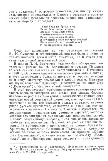 «Пифагорийцев» 2 я читал месяцев пять назад, но сейчас помню их от строки до строки, помню внушенные ими чувства любви, любования и зависти. Ваша способность обновлять наши представления о том, что является в данный момент Вашей темой, сказалась здесь во всем своем блеске. О Сопикове3 писали и Берков и Эйхенгольц, и Поляков, и Сухомлинов, и Юрий Верховский4 , и только в Вашей статье он (впервые!) явился в своем подлинном виде5 . Мы привыкли к другому Сопикову, и Вы разрушили нашу привычку. Так же поступили Вы с письмом Белинского к Гоголю, с Сухачевым, с Феоктистовым…6 Я не говорю уже о Пифагоровой секте, которую проморгали и В.И. Семевский7 и Нечкина8 … Не говорю и о «кишке последнего попа», которую Вл. Орлов9 приписывает не Сильвену Марешалю10 , а Дени Дидро (см. его книгу «Декабристы», стр. 637 11).