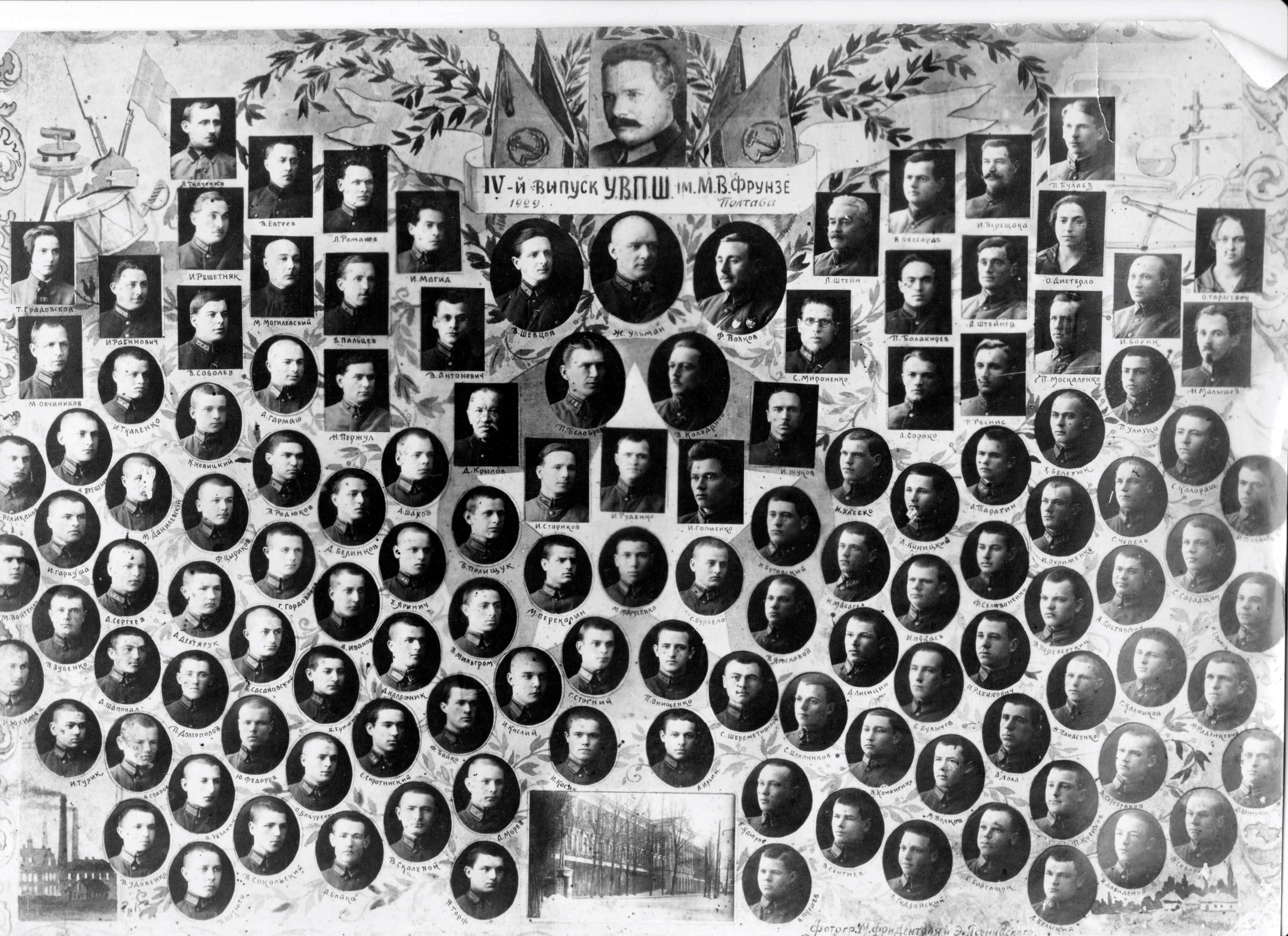 [4]Украинская военно-подготовительная школа им. М.В. Фрунзе. В 1925 г. передислоцирована из Харькова в Полтаву. В 1926 г. школе присвоено имя М.В. Фрунзе. Размещалась в здании бывшего Кадетского корпуса (ул. Октябрьская № 42). С 1929 г. - Полтавская школа переподготовки командиров запаса РККА им. М.В. Фрунзе; с 1931 г. - Полтавские военно-политические курсы им. М.В. Фрунзе, с 1932 г. - Полтавская военно-политическая школа им. М.В. Фрунзе; с 1937 г. - Полтавское военно-политическое училище им. М.В. Фрунзе. В марте 1938 г. передислоцировано в г. Горький. Источник: Полтавщина: Энциклопедический справочник под ред. А.В. Кудрицкого. (Киев, 1992 год), стр. 919.
